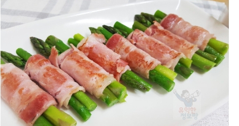 아스파라거스에 베이컨을 말아 구워 먹을 수 있습니다. 가공육인 베이컨 대신 대패삼겹살등 얇은 생고기를 말아 구워도 좋습니다.